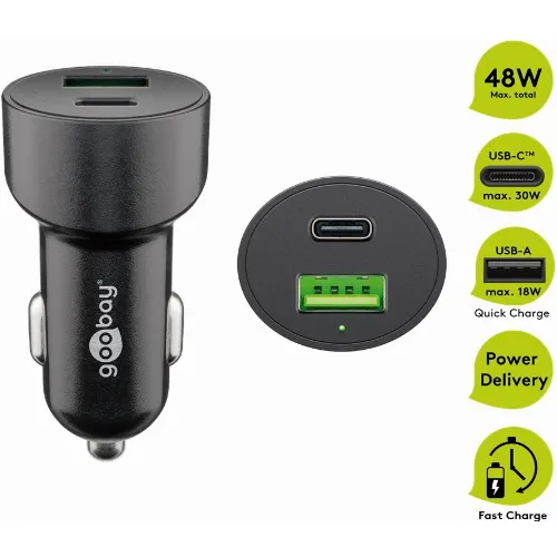 Goobay Dobbel USB-billader USB-C™ PD (Power Delivery) (48 W) 48 W (12/24 V) USB-A/USB-C™ passer til enheter med USB-C™ (Power Delivery), f.eks. iPhone 12