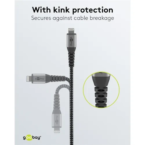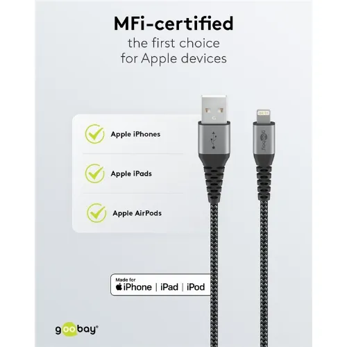 Goobay Lightning til USB-A tekstilkabel med metallplugger 0,5 m elegant og ekstra robust tilkoblingskabel for bl.a. Apple iPhone, iPad (Apple MFi-sertifisert)