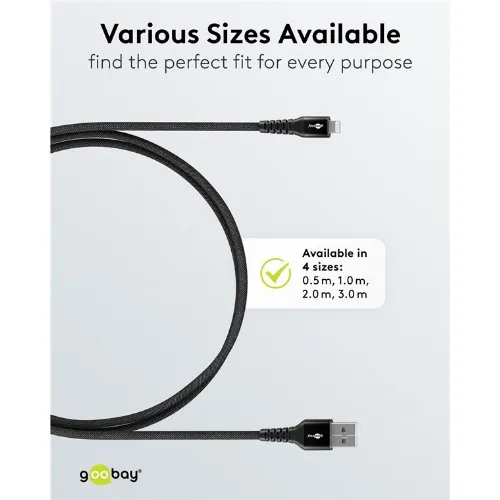 Goobay Lightning-USB-A supermyk tekstilkabel med metallkontakter, 2 m, svart MFi-sertifisert, elegant og ekstra robust lade- og synkroniseringskabel for Apple iPhone/iPad (svart)