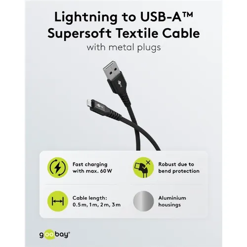 Goobay Lightning-USB-A supermyk tekstilkabel med metallkontakter, 3 m, svart MFi-sertifisert, elegant og ekstra robust lade- og synkroniseringskabel for Apple iPhone/iPad (svart)