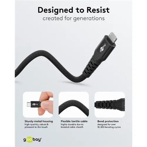 Goobay Lightning-USB-C™ supermyk tekstilkabel med metallkontakter, 1 m, svart MFi-sertifisert, elegant og ekstra robust lade- og synkroniseringskabel for Apple iPhone/iPad (svart)