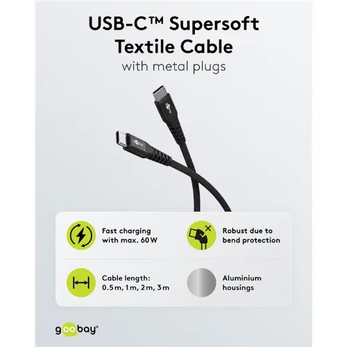 Goobay USB-C™ supermyk tekstilkabel med metallkontakter, 1 m, svart Elegant og ekstra robust tilkoblingskabel for enheter med USB-C™-port