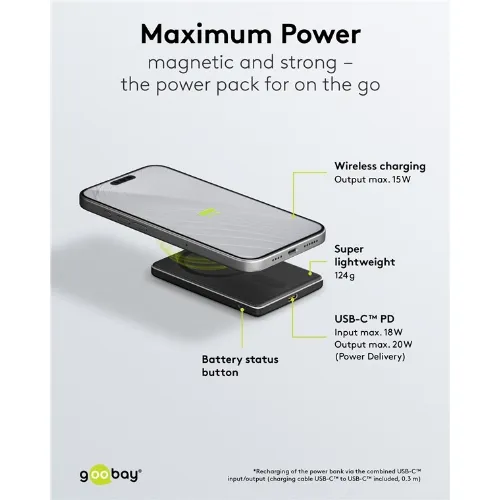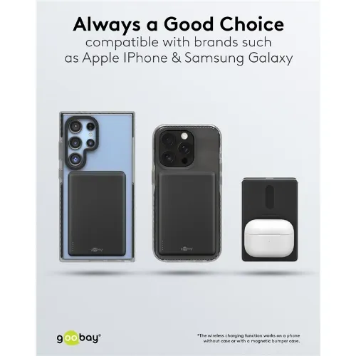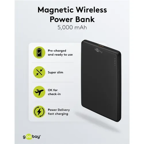 Goobay Magnetisk trådløs powerbank på 5 000 mAh festes magnetisk på baksiden av mobiltelefonen, perfekt for samtidig lading og telefonsamtaler