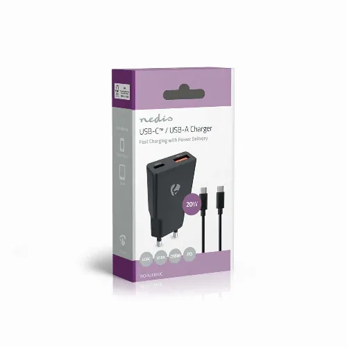 Nedis vegg lader | 20 W | GaN | PD3.0 | 1.5 / 2.0 / 2.22 A / 3.0 A | Antall utganger: 2 | USB-A / USB-C™ | USB Type-C ™ (løs) Kabel | 1.50 m | Automatisk Spenning Utvalg | Sort