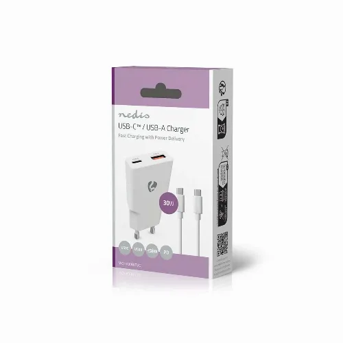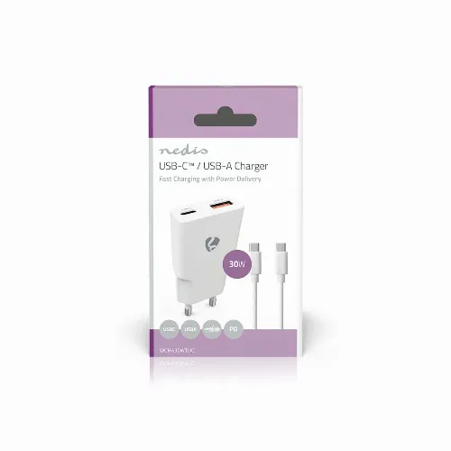 Nedis vegg lader | 30 W | GaN | PD3.0 | 1.5 / 2.0 / 2.5 / 3.0 A | Antall utganger: 2 | USB-A / USB-C™ | USB-C ™ (løs) Kabel | 1.50 m | Automatisk Spenning Utvalg | Hvit