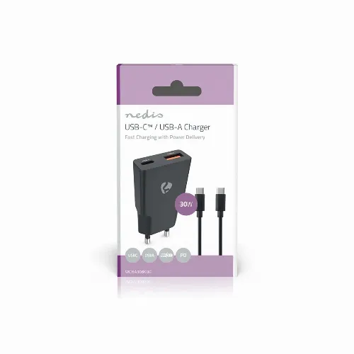 Nedis vegg lader | 30 W | GaN | PD3.0 | 1.5 / 2.0 / 2.5 / 3.0 A | Antall utganger: 2 | USB-A / USB-C™ | USB Type-C ™ (løs) Kabel | 1.50 m | Automatisk Spenning Utvalg | Sort